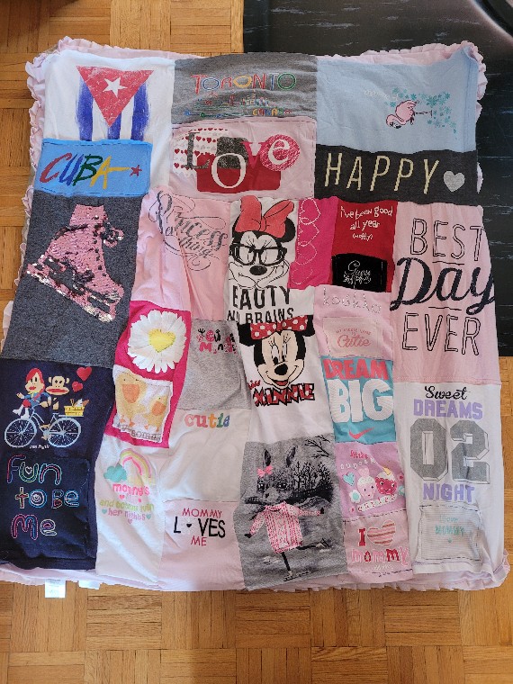 I finally took the time to make Caitlyn a blanket of her favorite t-shirts. When she was up to 3 years old Caitlyn really attracted herself to certain t-shirts and wouldn’t let me give them away. So I kept them and finally got the chance to sew them together and just attach the corners to her baby blanket. I’m not totally done yet, I want to buy some sort of embroidery to do all around, some bows and anything else that I can find. At least this much is done.